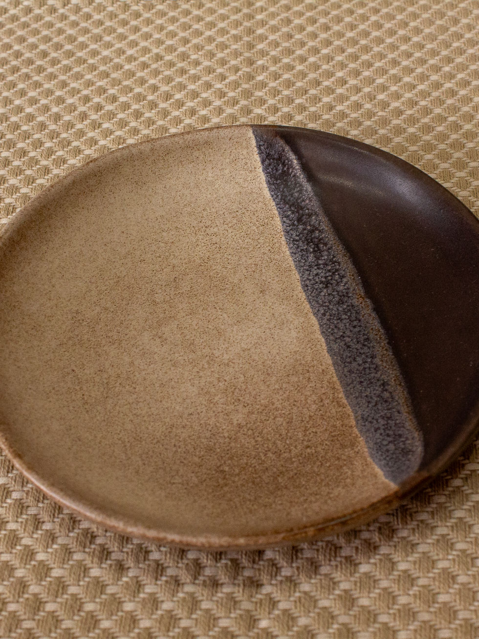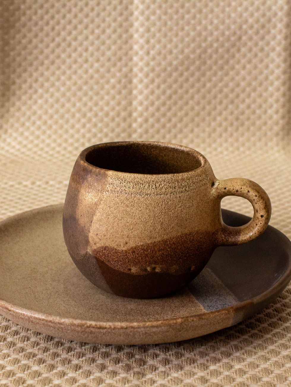 Este conjunto de chávena e pires em grés é uma peça singular de cerâmica artesanal portuguesa, com um acabamento marmoreado em tons castanhos naturais que evocam a textura da terra e o calor da tradição. A chávena tem um formato arredondado confortável na mão, ideal para o café ou chá do dia a dia. O pires, em perfeita harmonia, apresenta uma forma clássica com um acabamento semicircular que contrasta subtilmente entre o fosco e o vidrado.