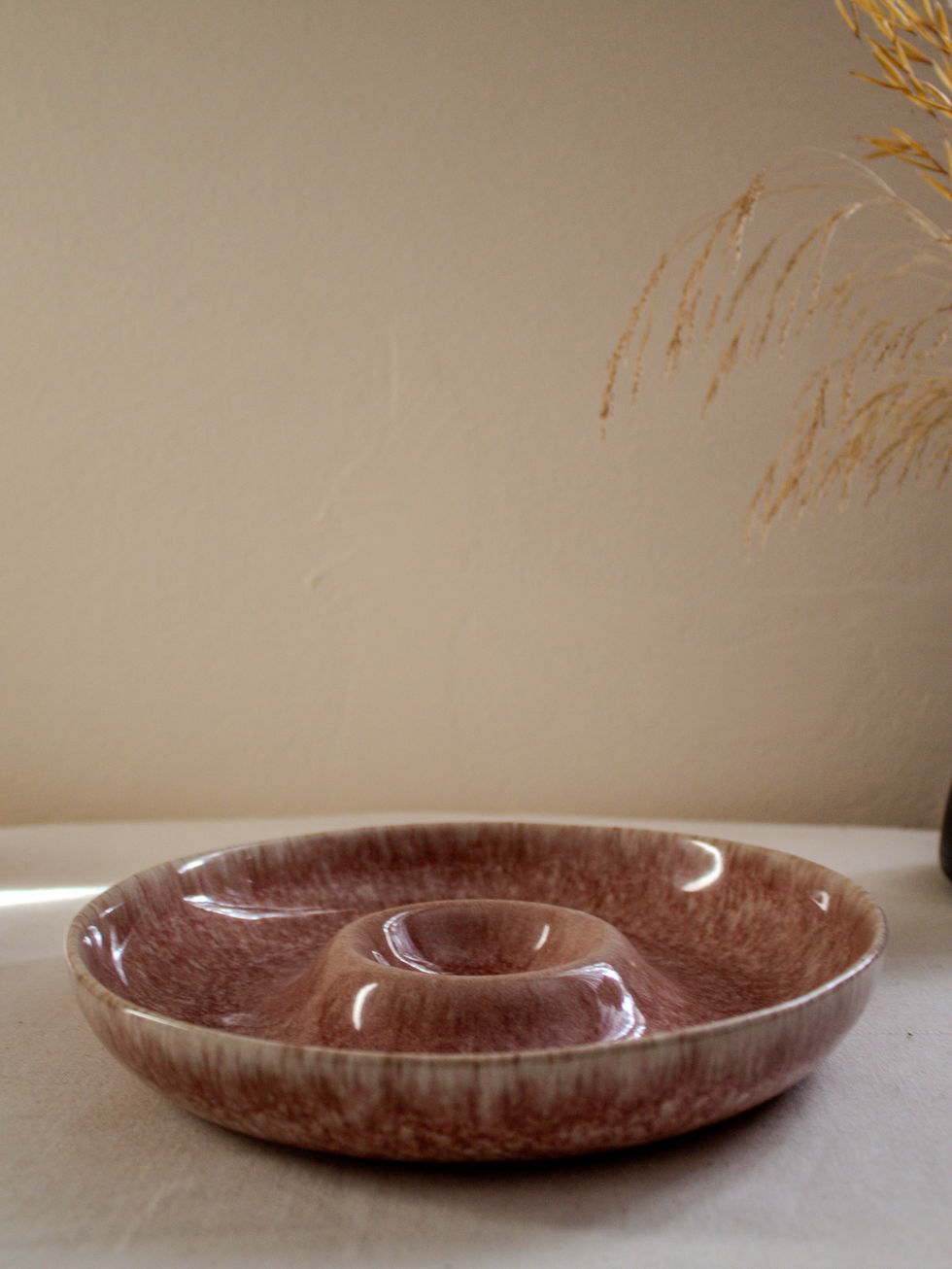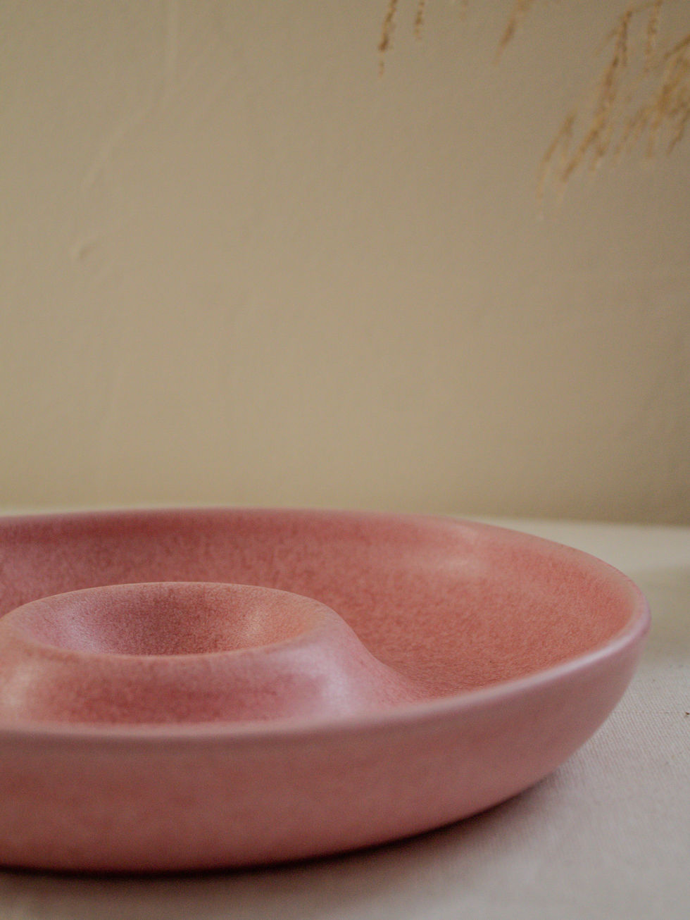 Com um design funcional e ao mesmo tempo decorativo, esta travessa de cerâmica é perfeita para apresentar entradas ou petiscos com um toque especial. O ressalto central permite colocar molhos ou pastas, enquanto a base circular acomoda ovos, tostas, palitos de vegetais ou outros aperitivos. Disponível em três cores distintas — mostarda, rosa e rosado marmoreado — adapta-se a diferentes estilos de mesa, sendo uma peça original e versátil para servir.