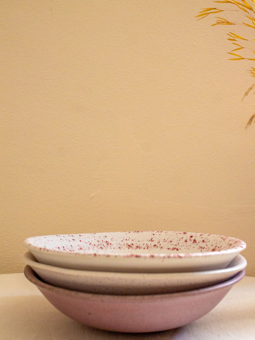 Com uma estética suave e contemporânea, estes pratos em grés vidrado combinam tons rosados delicados com texturas visuais que variam entre o mate uniforme, o salpicado expressivo e o rebordo decorativo. Perfeitos para o dia a dia ou para momentos especiais, acrescentam um toque artesanal e elegante à sua mesa.