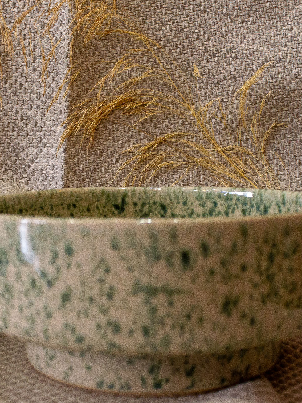 Esta tigela média em grés é uma peça distinta da cerâmica artesanal portuguesa, com um acabamento salpicado em tons de verde sobre fundo cru que remete à natureza e à frescura dos campos. O seu formato arredondado e base ligeiramente elevada conferem-lhe um carácter funcional e decorativo, ideal tanto para servir como para embelezar a mesa. Versátil e cheia de personalidade, esta peça destaca-se pela sua textura vidrada suave e pelo padrão orgânico que torna cada exemplar único.